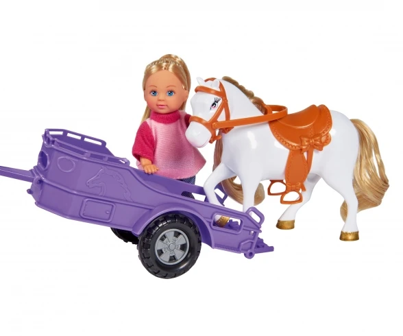 Adventure-seeking Evi is looking forward to taking you for trips out in her off-roader. The pink jeep and matching trailer match Evi’s outfit beautifully. There’s plenty of space in the trailer for the little horse.Suitable for children aged 3 and over.