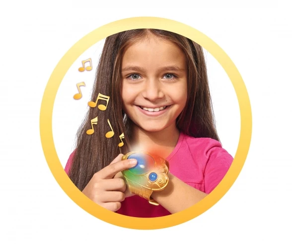 | This beautiful bracelet allows you to step into the wondrous world of Centopia, just like Mia. Children can think up exciting stories revolving around Mia and her world and re-enact them at home. If you press the large gemstone on the bracelet, the popular “Mia and me” melody can be heard and the bracelet lights up in amazing colours just like in the TV series. This invites young girls to sing along and transports them to the wondrous world of Mia. The “Mia and me” bracelet featuring light and sound effects from Simba Toys is suitable for children aged 3 years and over and is a must-have for all “Mia and me” fans. |