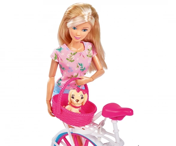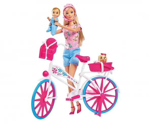 Steffi is well equipped for cycle touring. Her trendy bike has space for her baby in a baby seat and her dog in a doggy basket. She wears a helmet to keep her safe on her little jaunt. Suitable for children aged 3 and over.